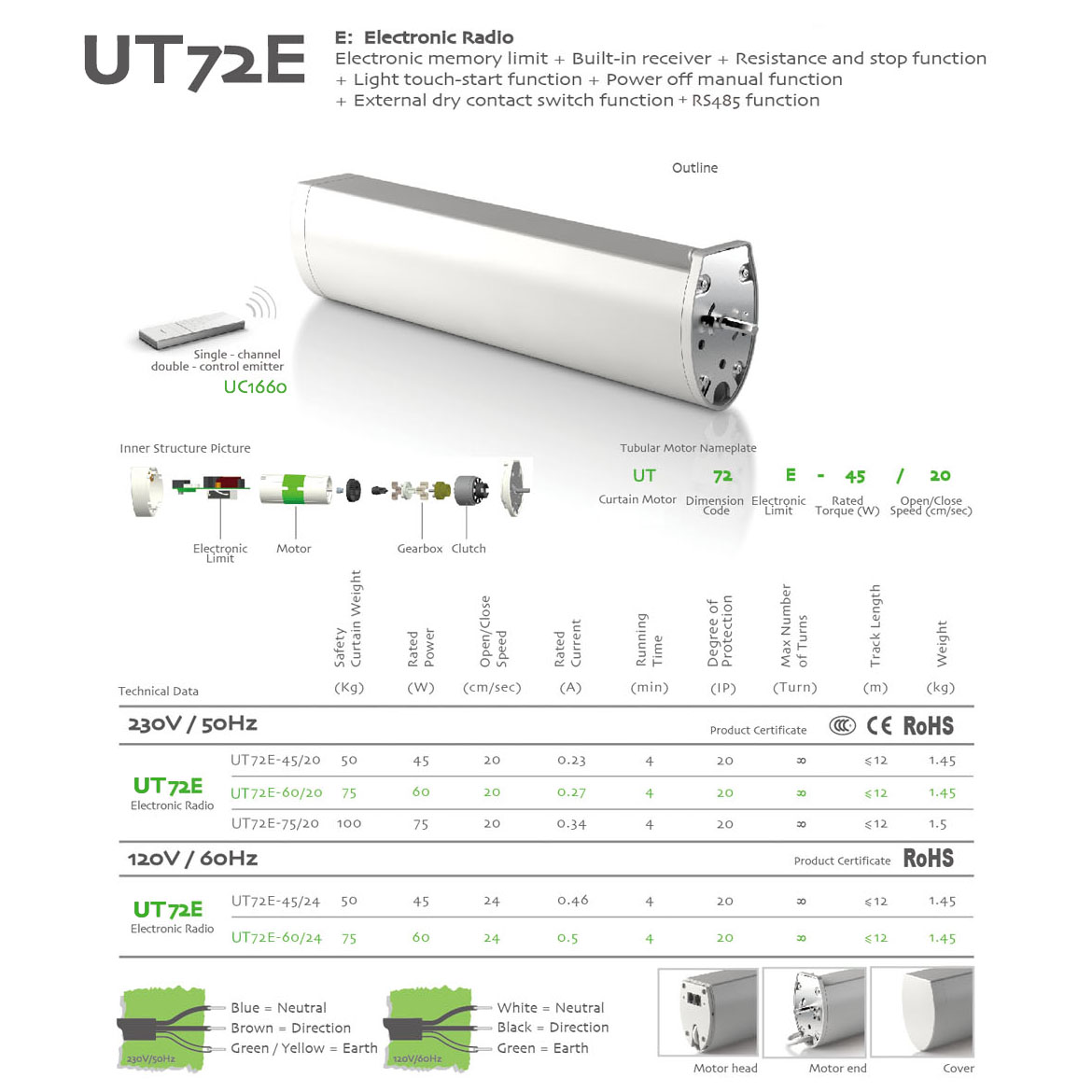 Memorized Limit+Integrated Radio Control+Obstruction Detection+Light touch-start+Manual Override+The third limit position+Compatible with dry contact switch function.